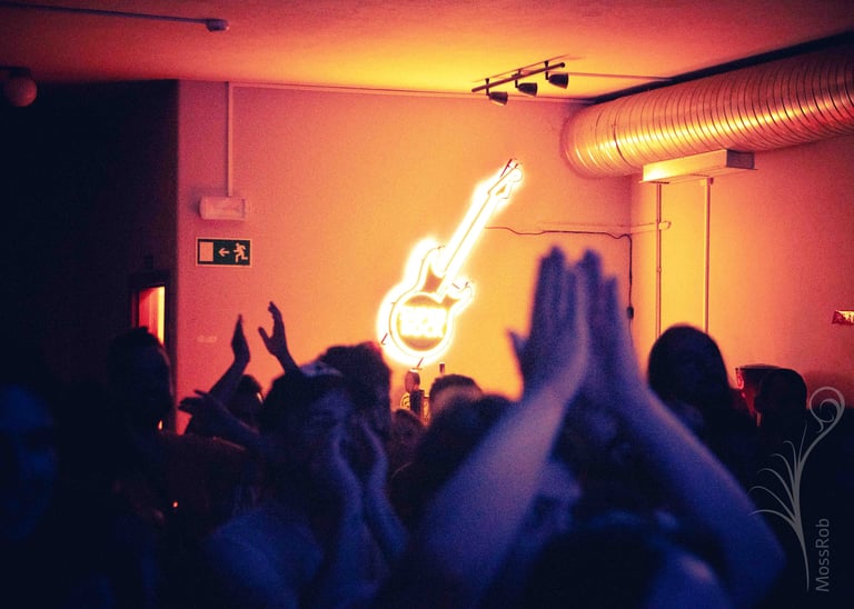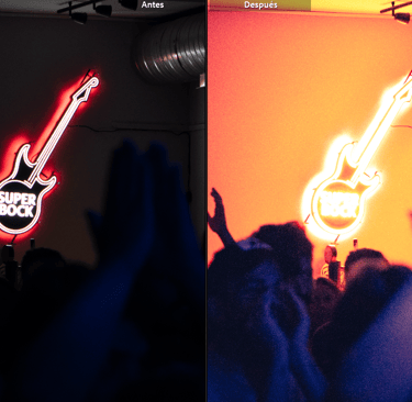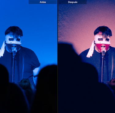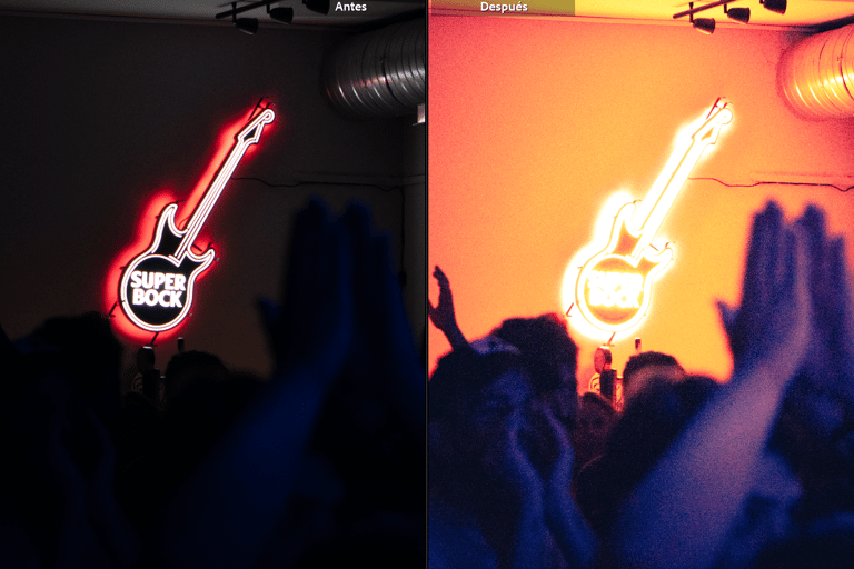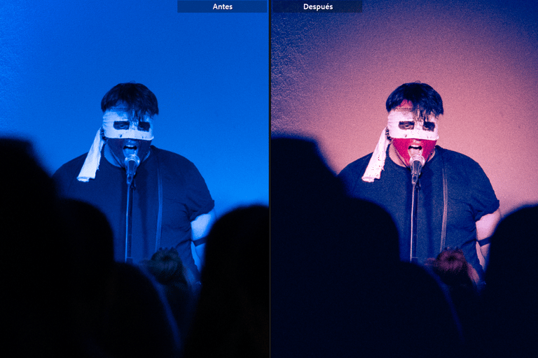 Recuperar el dinamismo de los colores fue una tarea ardua. La información estaba oculta en las sombras y la cantidad de ruido al recuperar las formas en muchos casos era inaceptable. Pero creo que conseguí encontrar una coherencia estilística en las fotografías, utilizando el ruido de la imagen como parte del estilo duro y desinhibido de la música que invocaba una atmósfera frenética. Pero, además, encontrar una mezcla de colores complementarios entre los tonos altos y las sombras que diferenciase elementos de su entorno que ayudaría a describir mejor los contornos que guíen a los ojos a saber qué mirar. Hay colores que no existían en la escena, pero es un trabajo para tomarse algunas libertades creativas.